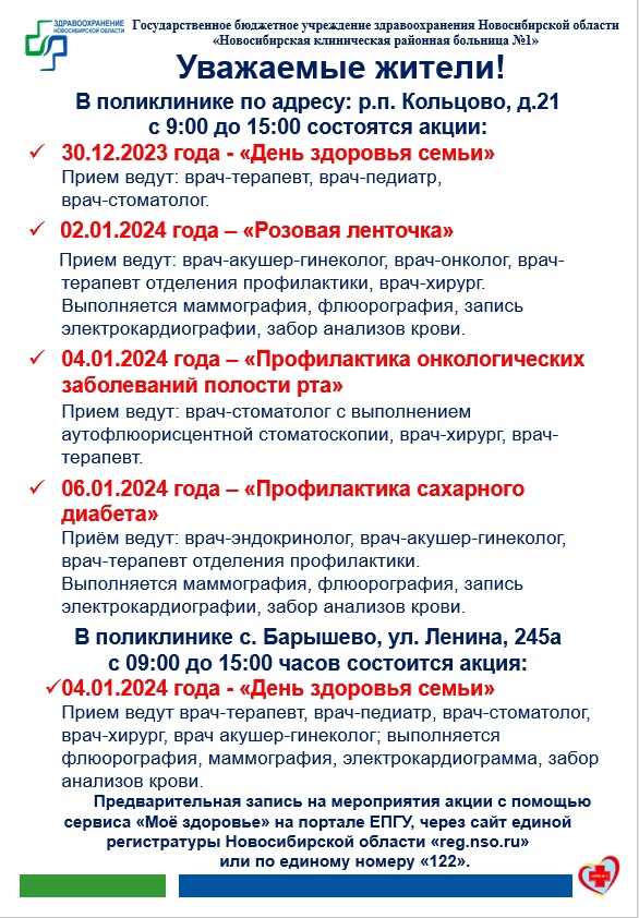 Четыре акции для проверки здоровья проведут в Кольцово в новогодние каникулы