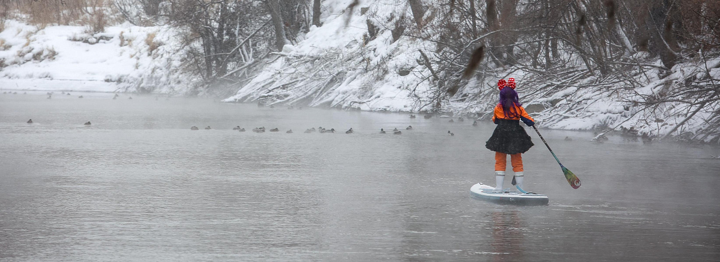 В середине декабря неунывающие сапбордисты попали в ледяной затор на одном из городских водоёмов. Позже федерация сапсёрфинга устроила традиционный новогодний заплыв на протоке у острова Кудряш. Деды Морозы, Снегурочки и прочие сказочные персонажи надели под свои праздничные наряды гидрокостюмы.